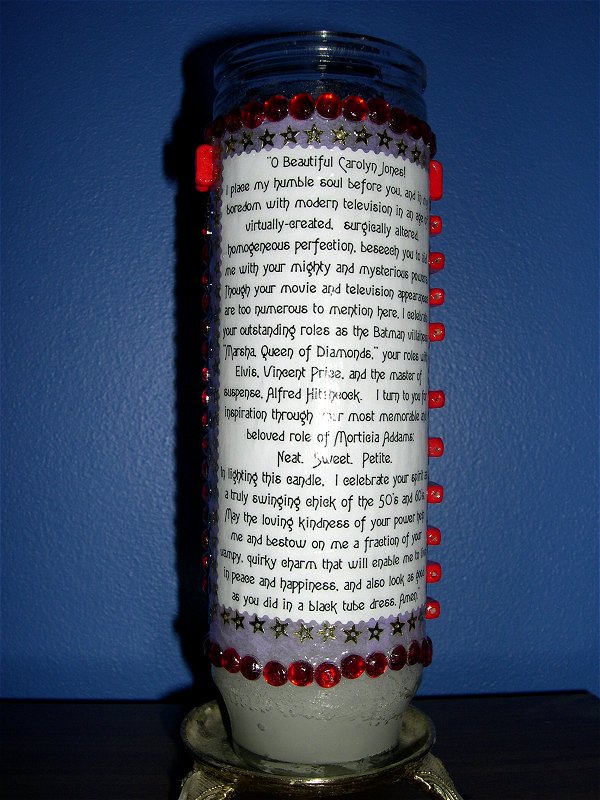 I created this lovely, decoupaged, and oh-so-tasteful inspirational candle for Carolyn Jones and wrote a prayer for her. Here's the fine print on the back: "O, Beautiful Carolyn Jones! I place my humble soul before you, and in my boredom with modern television in an age of virtually-created, surgically altered, homogeneous perfection, beseech you to aid me with your mighty and mysterious powers. Though your movie and television appearances are too numerous to mention here, I celebrate your outstanding roles as the Batman villainess 'Marsha Queen of Diamonds,' your roles with Elvis, Vincent Price, and the master of suspense, Alfred Hitchcock. I turn to you for inspiration through your most memorable and beloved role of Morticia Addams: Neat. Sweet. Petite. In lighting this candle, I celebrate your spirit as a truly swinging chick of the 50's and 60's. May the loving kindness of your power help me and bestow on me a fraction of your vampy, quirky charm that will enable me to live in peace and happiness, and also look as good as you did in a black tube dress. Amen. " |
